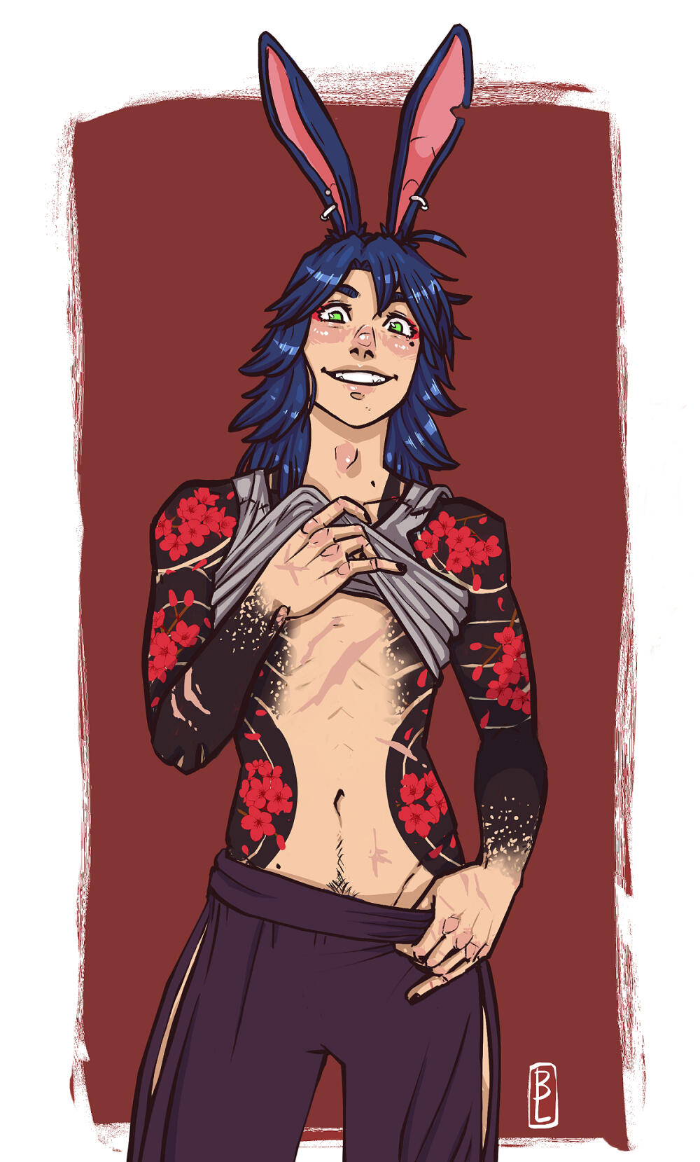Build: Surprisingly lean for the amount of time he spends hefting a giant axe around. Strong but maintaining the speed and flexibility important for street fights martial artsDistinguishing Features: Tattoos that wrap his upper body like a jacket - covering both arms, his sides and his back in patterned black with vivid red flowers scattered on top. There are red accents drawn in at the corners of his eyes as well as a "beauty mark" below his left eye.