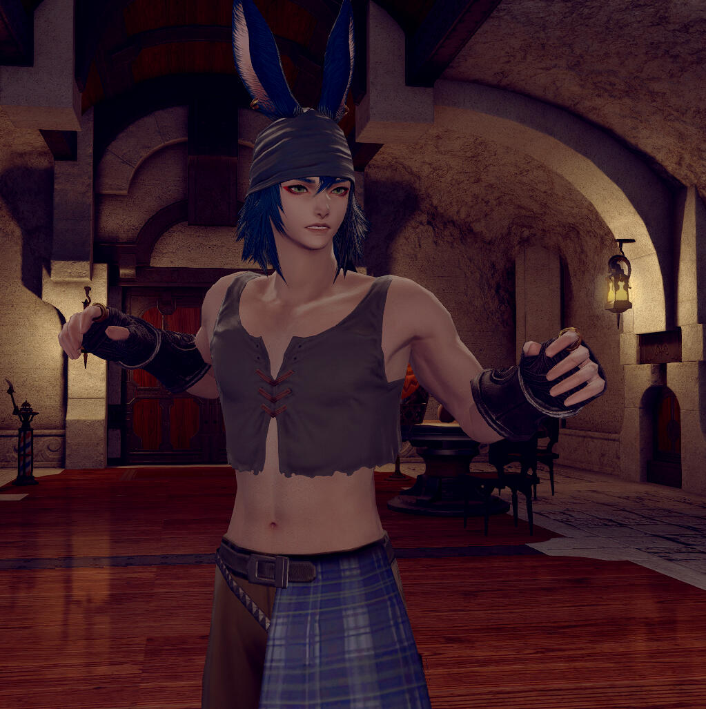 THE EARLY DAYS: Lark is from a Veena village that he doesn't remember beyond a rotating cast of irritated women telling him to stop touching things and asking if he has anywhere else he needs to be.Until the day he met his dads. Well, "met" is... reductive phrasing for what was more of an "accidental kidnapping/impromptu adoption" by a couple of conmen who were chased off with arrows fired in their wake - thanks to a friendly (loud) kit getting underfoot. In the chaos of a well laid plan gone to shit, they grabbed what they could before making tracks; unfortunately, one of the things grabbed happened to be that same con scuttling kit. By the time the dust settled and they realized their mistake there wasn't any going back to put the kid where he belonged. And they couldn't just leave him out in the woods...A bit unorthodox, but he presented as a male a few cycles later, so they figured no harm, no foul. The kid just got an early start on his post-village living in the big bright city of Kugane.This post-village living was less "learning to survive in the Woods" and the "Honour of a Woodwarder" and more "learning how to street fight" and "the best way to shake down businesses behind on their protection money". Though, he never excelled at the latter -- there was always a higher chance he'd be found running chores for the shop owners and helping with household repairs because they "asked real nice" or "looked like they were havin' a hard time".PRESENT: He's found himself in Limsa Lominsa as of very recently - he doesn't have much of a plan beyond a nebulous "waiting". Gil has gotten scant so it's probably time he found himself some work (and a place to stay that isn't flopped over some boxes on the pier...)